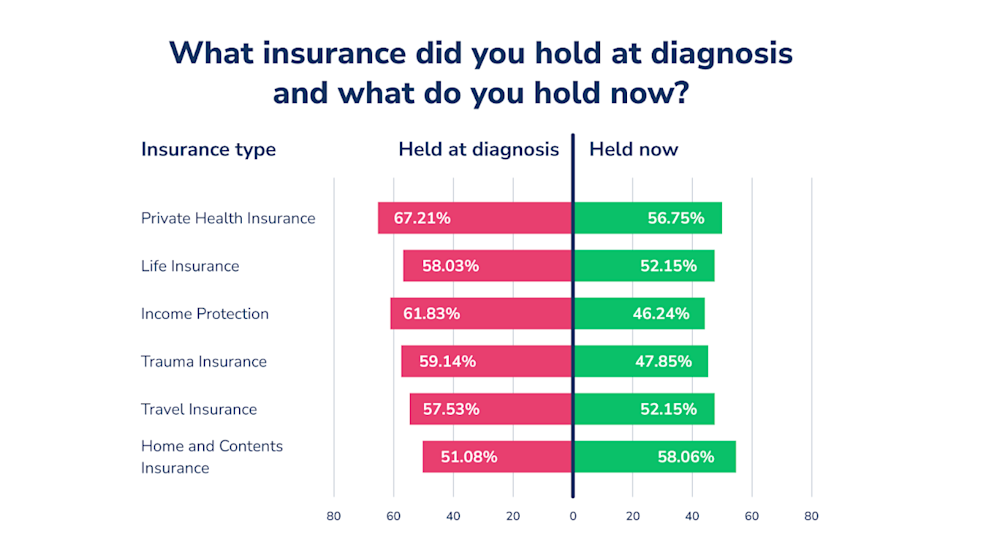 Respondents are far less likely to hold health and life insurance and income protection as compared to when they were diagnosed. This rate fell from 67.2% holding it at diagnosis to 56.8% holding it currently. Supporting qualitative statements from respondents could attribute this rate drop to unsatisfactory experiences with their insurance coverage - with 12.62% of respondents wishing they had known exactly what was covered by private insurance before they had their diagnosis.