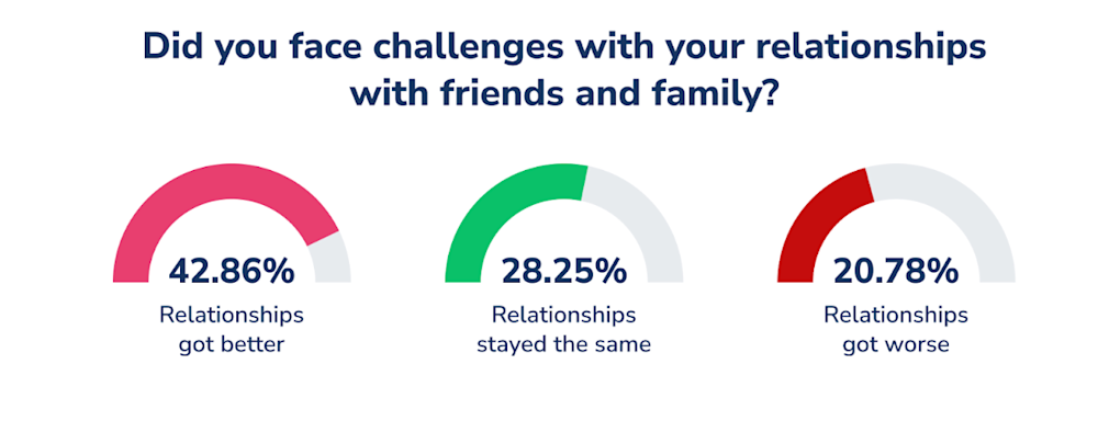 Respondents were asked if they had faced any challenges in their relationships with friends and family. 63.64% of respondents reported changes in these relationships - with 42.68% reporting their relationships getting better, and 20.78% reporting their relationships getting worse.
