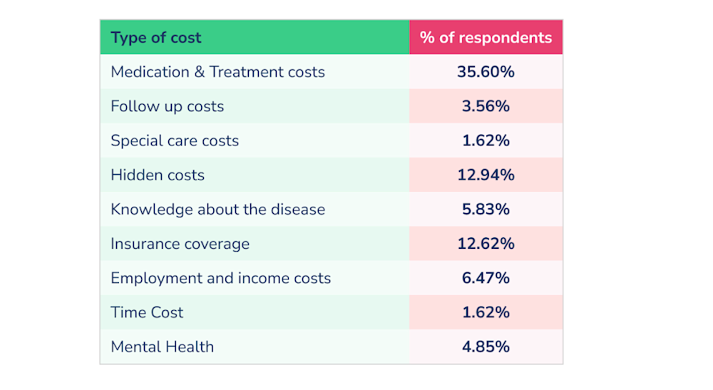 Respondents were asked what they wished they knew before experiencing diagnosis. 53.72% of respondents reported answers associated with the costs of treatment including medication, treatment, special care costs and hidden costs.