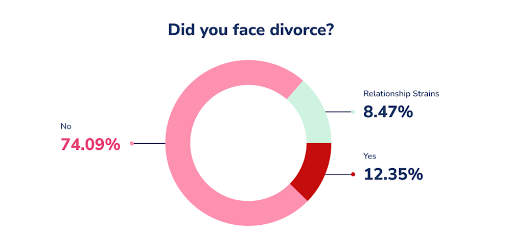Respondents were asked if they experienced separation or divorced after their breast cancer treatment. 12.35% reported experiencing separation or divorce, with another 8.47% reporting that their diagnosis or treatment caused some strains in their relationships.