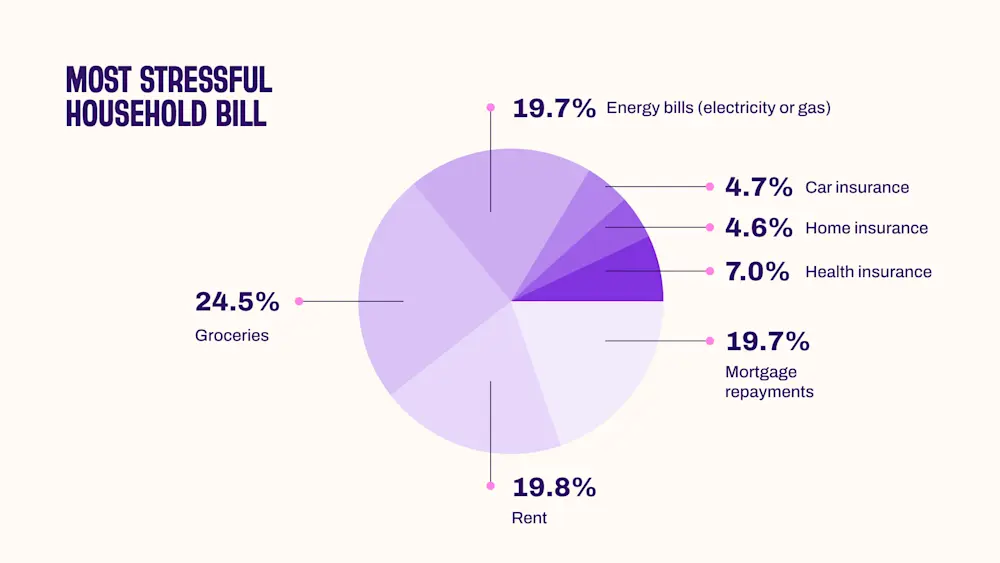 When asked which bill is causing the most financial stress, groceries came out on top at 24.5%. That reflects how visible and frequent food costs are in day-to-day life. But the story is broader than supermarket spending alone. Rent, mortgage repayments and energy bills all sit clustered close behind, showing that pressure is spread across the core pillars of household budgeting.